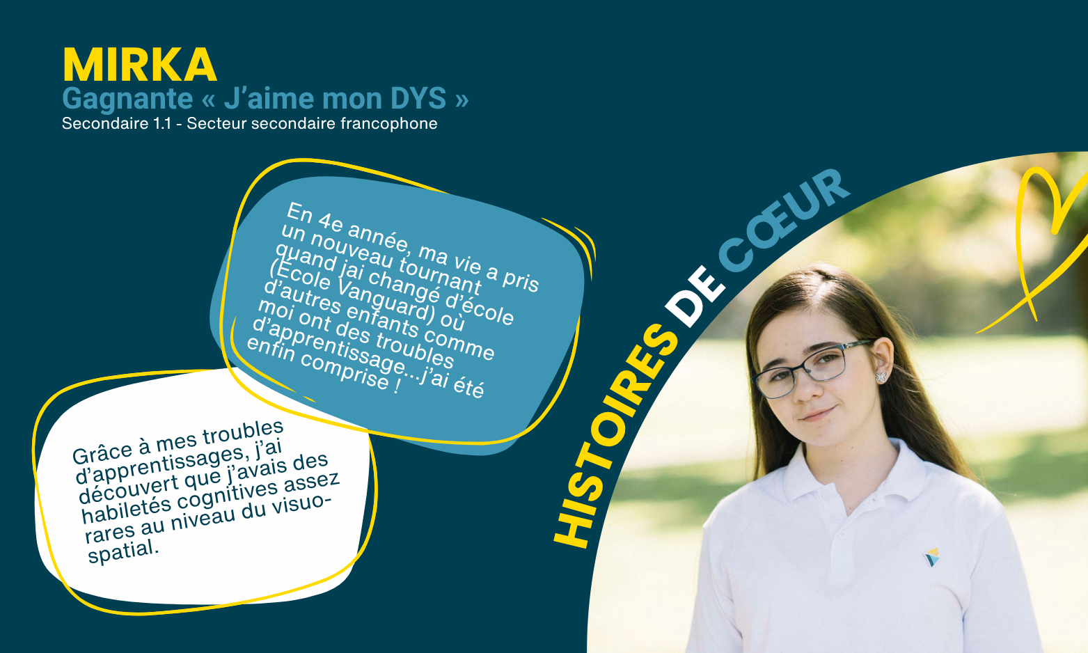 Saviez-vous qu’une de nos élèves a gagné le concours J’aime mon DYS cette année ? Allez lire le magnifique texte de Mirka sur leur site Web. Elle nous explique comment elle a découvert que ses troubles d’apprentissage faisaient partie d’elle et ce qu’elle en retire de positif !